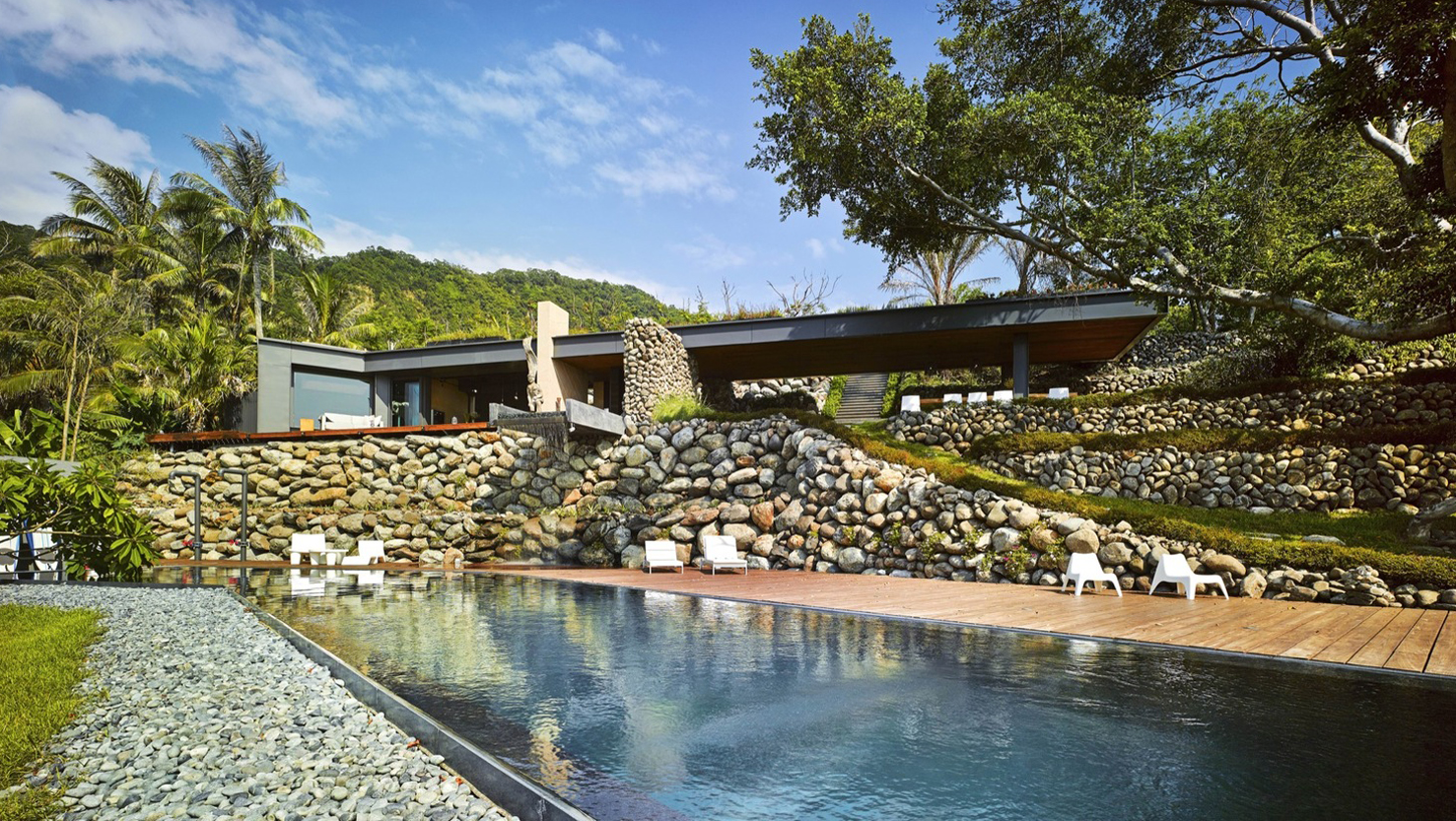 With a humble posture in front of the majestic sea, the structure extends with a relatively low profile along the contour of the coastline, following its bend as if opening itself to the sea at an angle of 130. The steel frame is cladded with native rocks and the living roof with various herbs serves as a walkway on a plateau. Utilizing the natural background to hide the handmade elements, the wide stone stairway descends from the plateau to the open-air foyer of the building.